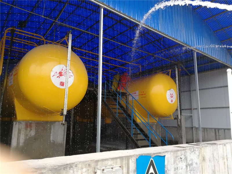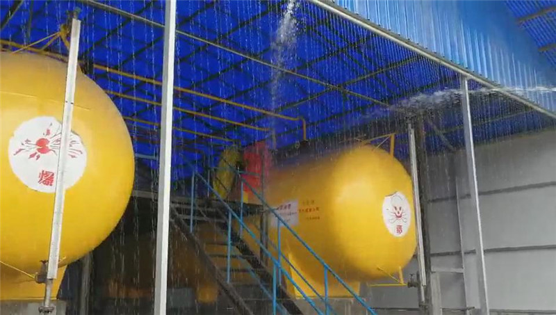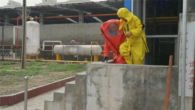 6月21日上午10時,隨著焦作市地豐肥業(yè)有限公司上空警報(bào)器拉響,發(fā)現(xiàn)“險情”的氨站工作人員周立榮、王馬對手提防毒面具趕到現(xiàn)場進(jìn)行檢查,在2號氨罐聞到氨味后,迅速佩戴防毒面具走進(jìn)巡查,發(fā)現(xiàn)2號氨罐頂部出口有大量液氨泄漏,立即判斷為氨罐出口閥閥體破裂造成液氨泄漏,趕緊向班長陳新政報(bào)告,氨站操作人員迅速打開安全應(yīng)急水幕噴淋,由此拉開了公司液氨泄漏應(yīng)急演練的序幕。